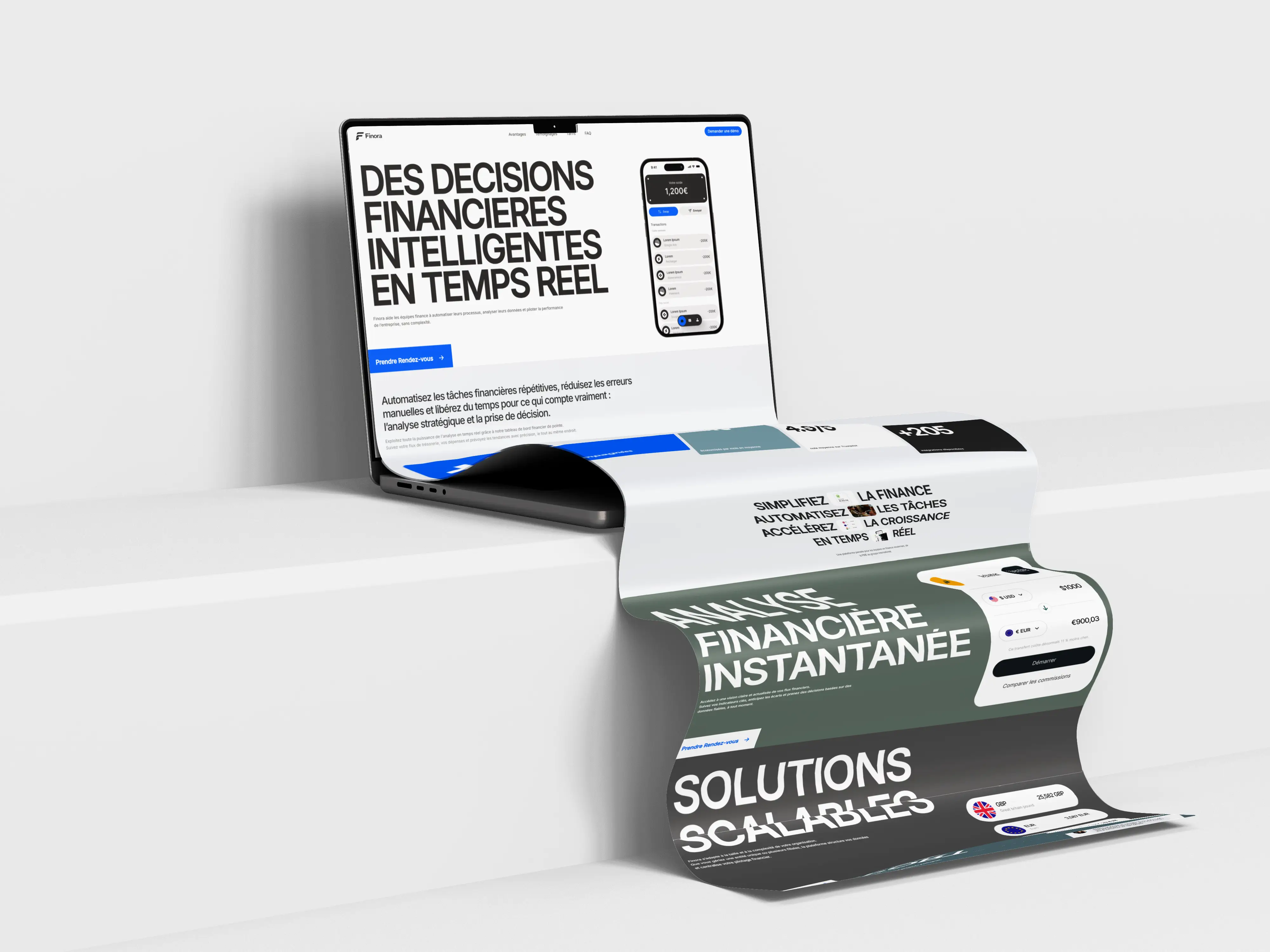 La landing page s’articule autour de messages simples et concrets : automatisation des tâches financières, analyse en temps réel, solutions évolutives et accompagnement expert. Les sections valorisent les bénéfices métiers, les usages réels et les résultats observés par les équipes, afin de projeter les décideurs dans une utilisation concrète de Finora.